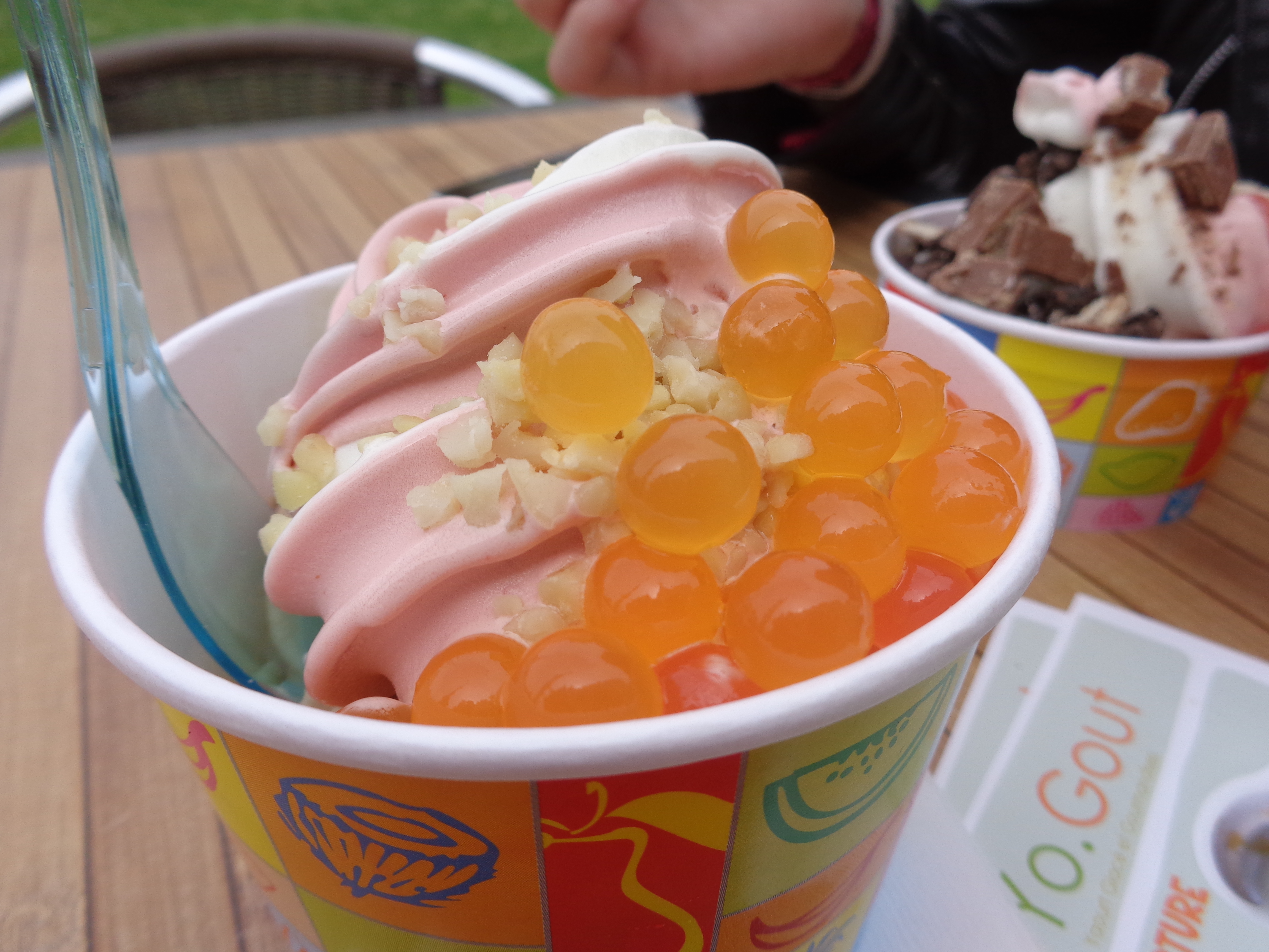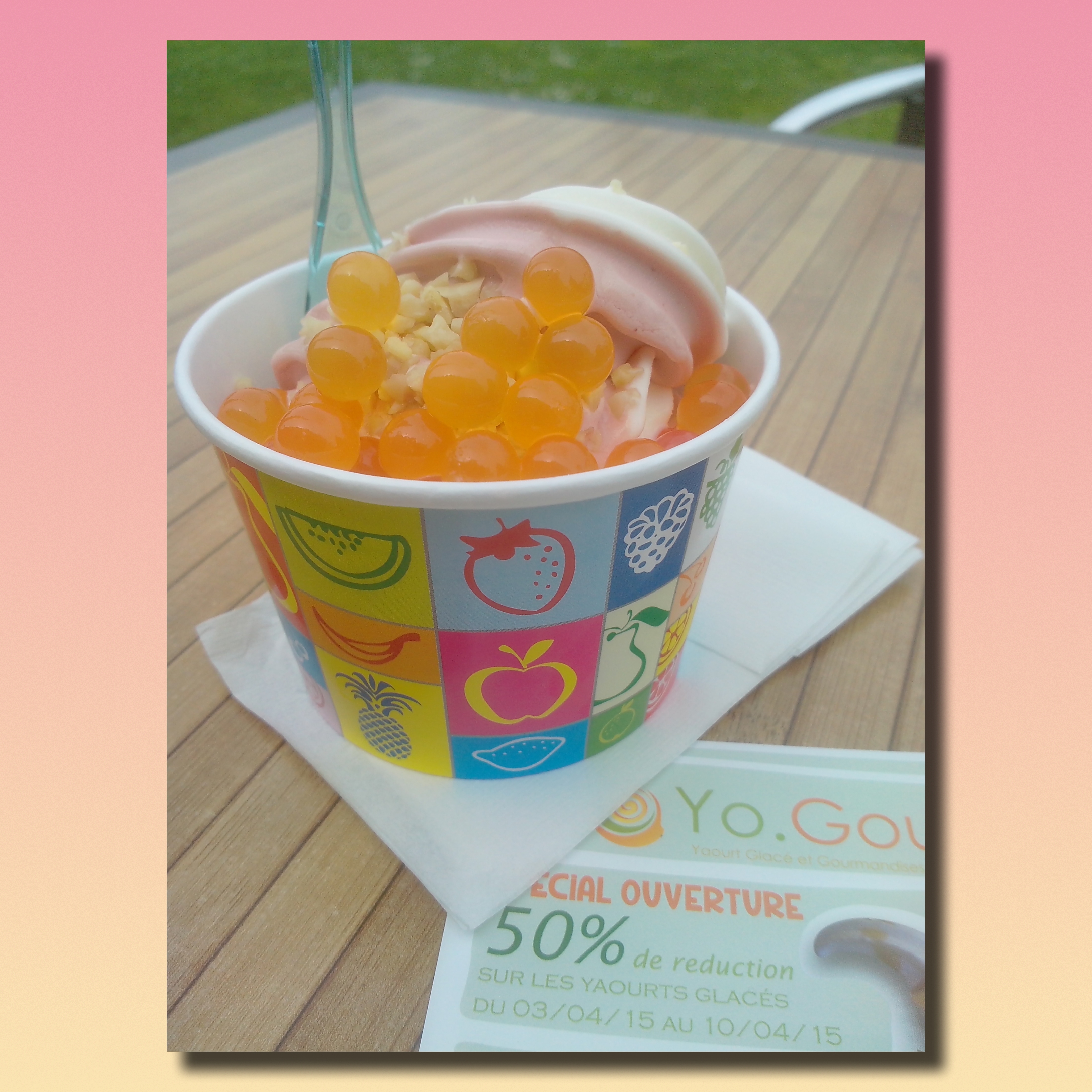 Chez Yo-Gout, tu prends ton petit (ou gros) pot vide, que tu remplis toi-même de yaourt glacé, et choisissant ton parfum, ou en les combinant (je mélange les parfums, je n’arrive pas à en choisir un seul !), puis ensuite, tu passes au « topping » : ces petits plus que tu vas rajouter dessus : des amandes, des morceaux de biscuits, des billes de fruits (ah ça, j’adore, ça éclate dans ta bouche c’est terrible !), des bonbons, des amandes, des fruits, …etc…