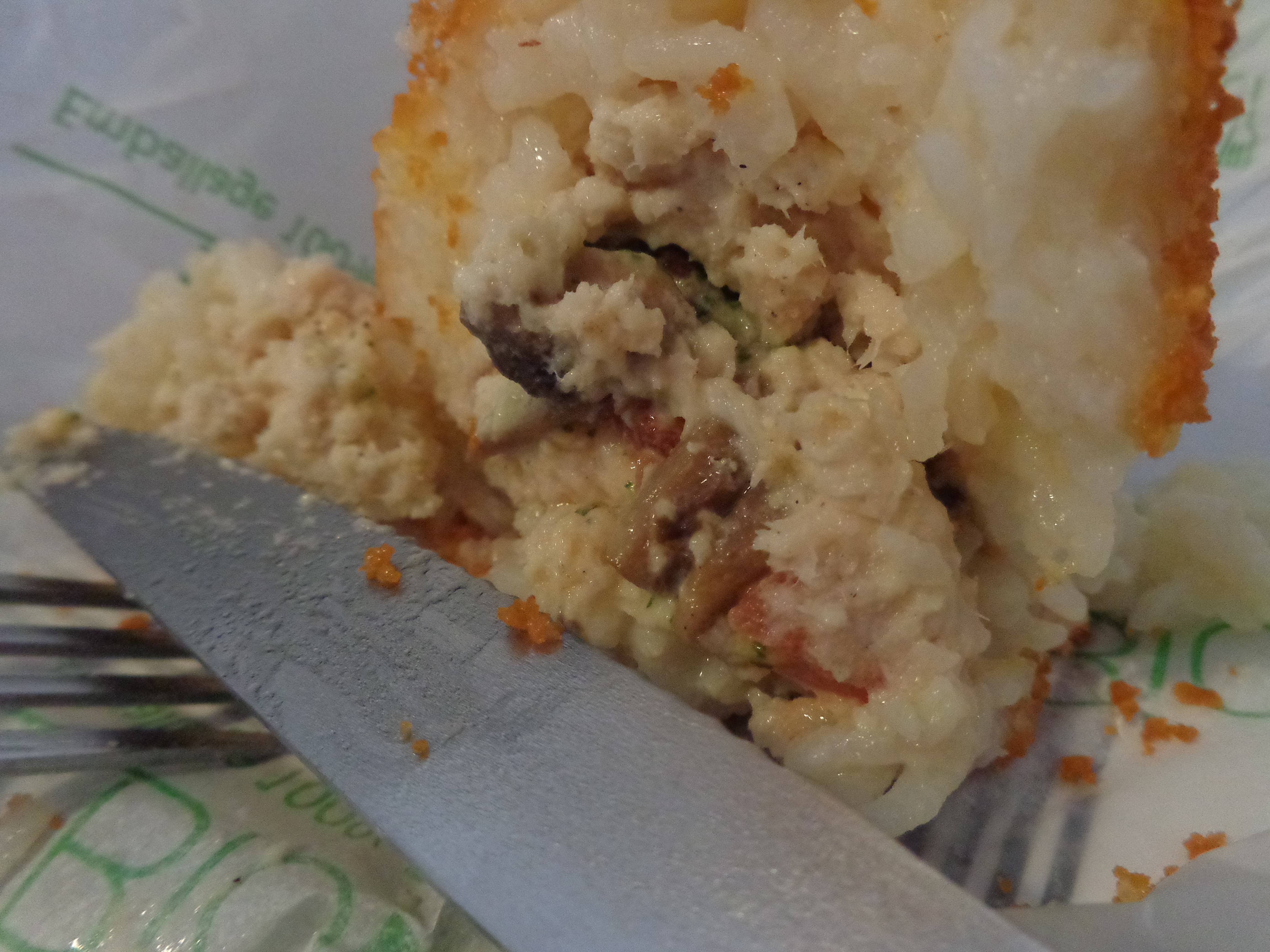 Les suppli c’est romain, ce petit truc, ça se présente comme une boulette de riz (type risotto, ça j’en suis dingue, du risotto), avec en son cœur du fromage, de la mozzarella bien filante, tout ça pané et frit (oui effectivement, tu me fais remarquer que ce n’est pas forcément diététique, mais je te signale aussi que tu n’es pas sur un blog traitant de la diététique, non, non, non ! Bien que je n’aie rien contre un peu de diététique, hein, seulement…là n’est pas le sujet, ça me rendrait trop malheureuse de faire un blog de régime d’ailleurs.)
