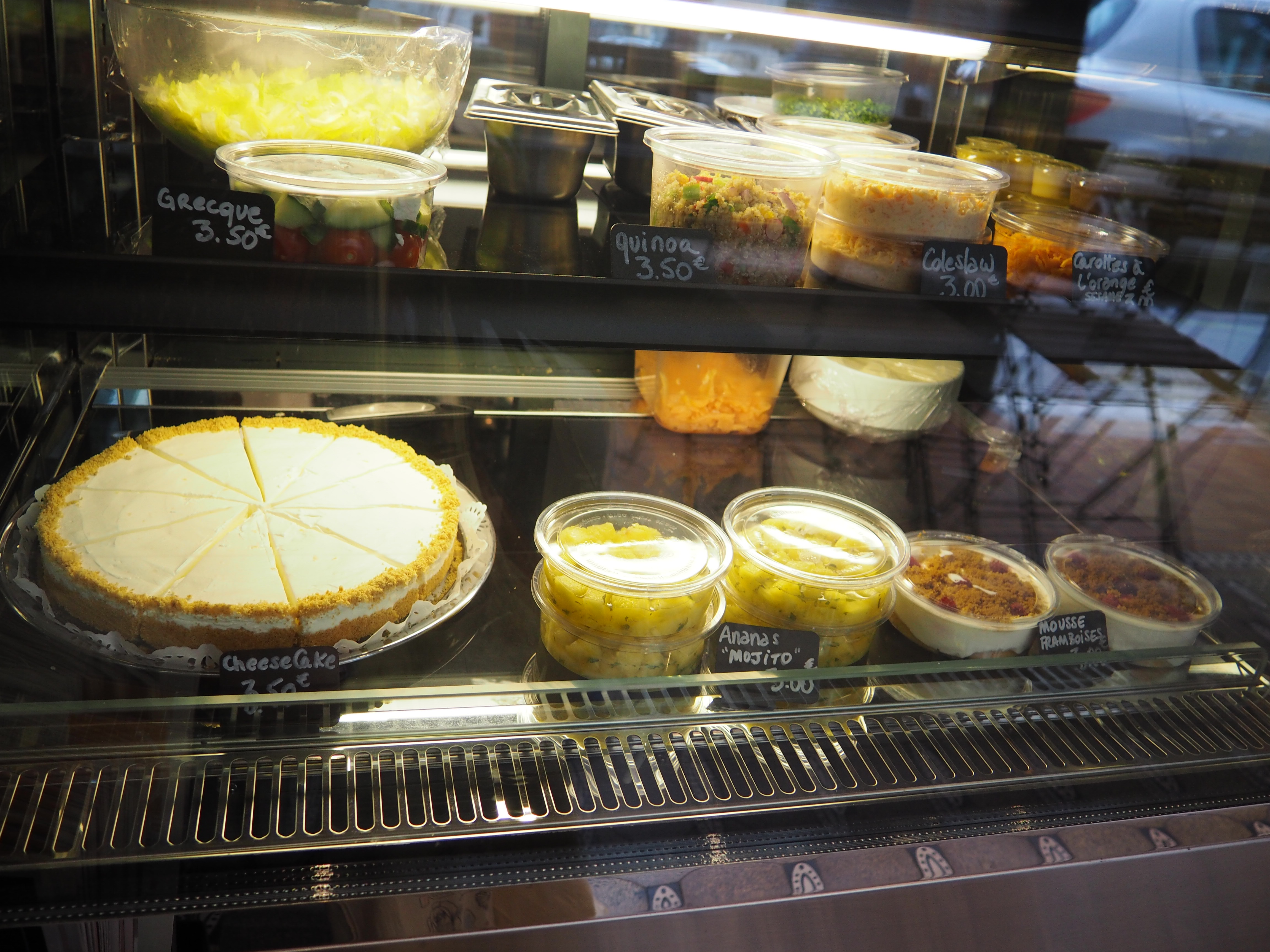 On peut aussi choisir des entrées (toutes fraiches et faites maison aussi) : salade quinoa et petits légumes croquants, salade de carottes et orange, coleslaw, etc.. (du végétarien donc !)