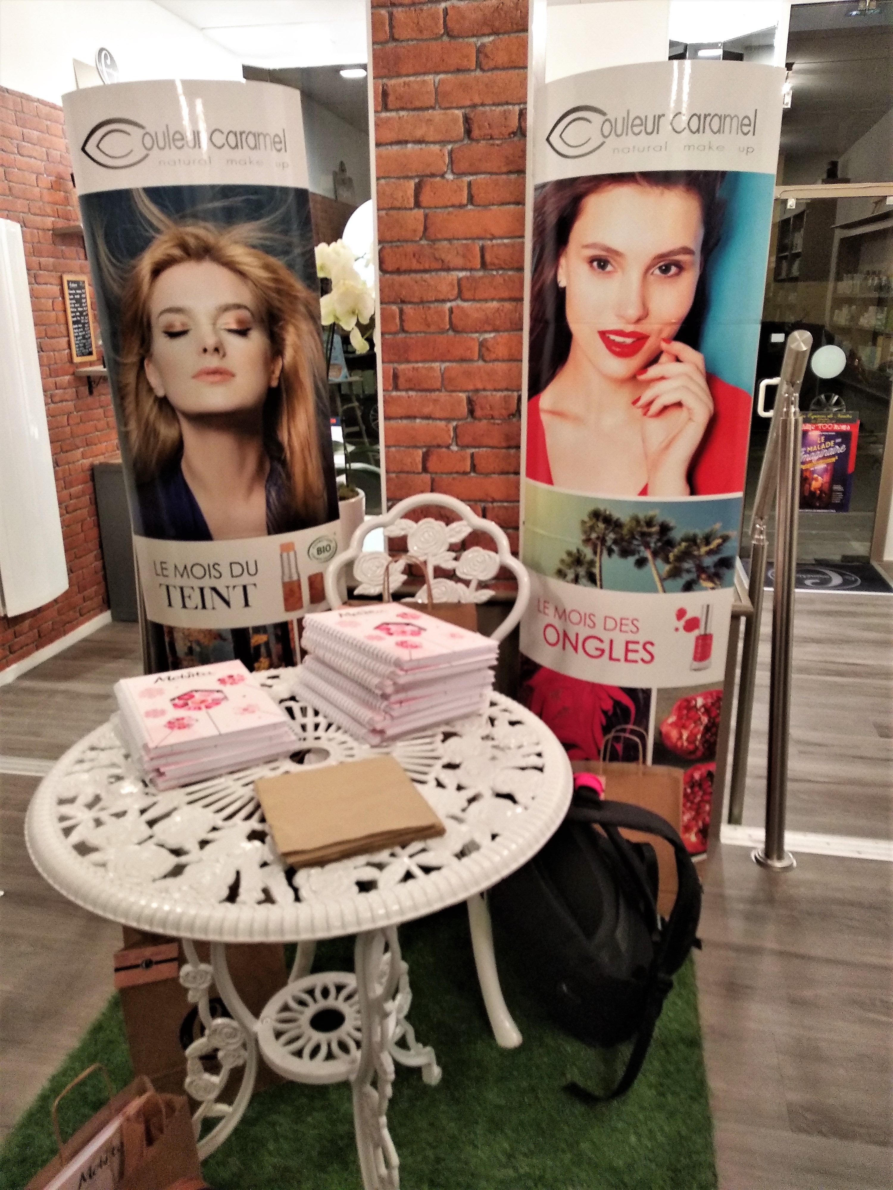 “La Coquetterie” : Couleur Caramel. Sur conseil, possibilité de maquillage et/ou de pose de vernis sur place, pour voir en réel le résultat.