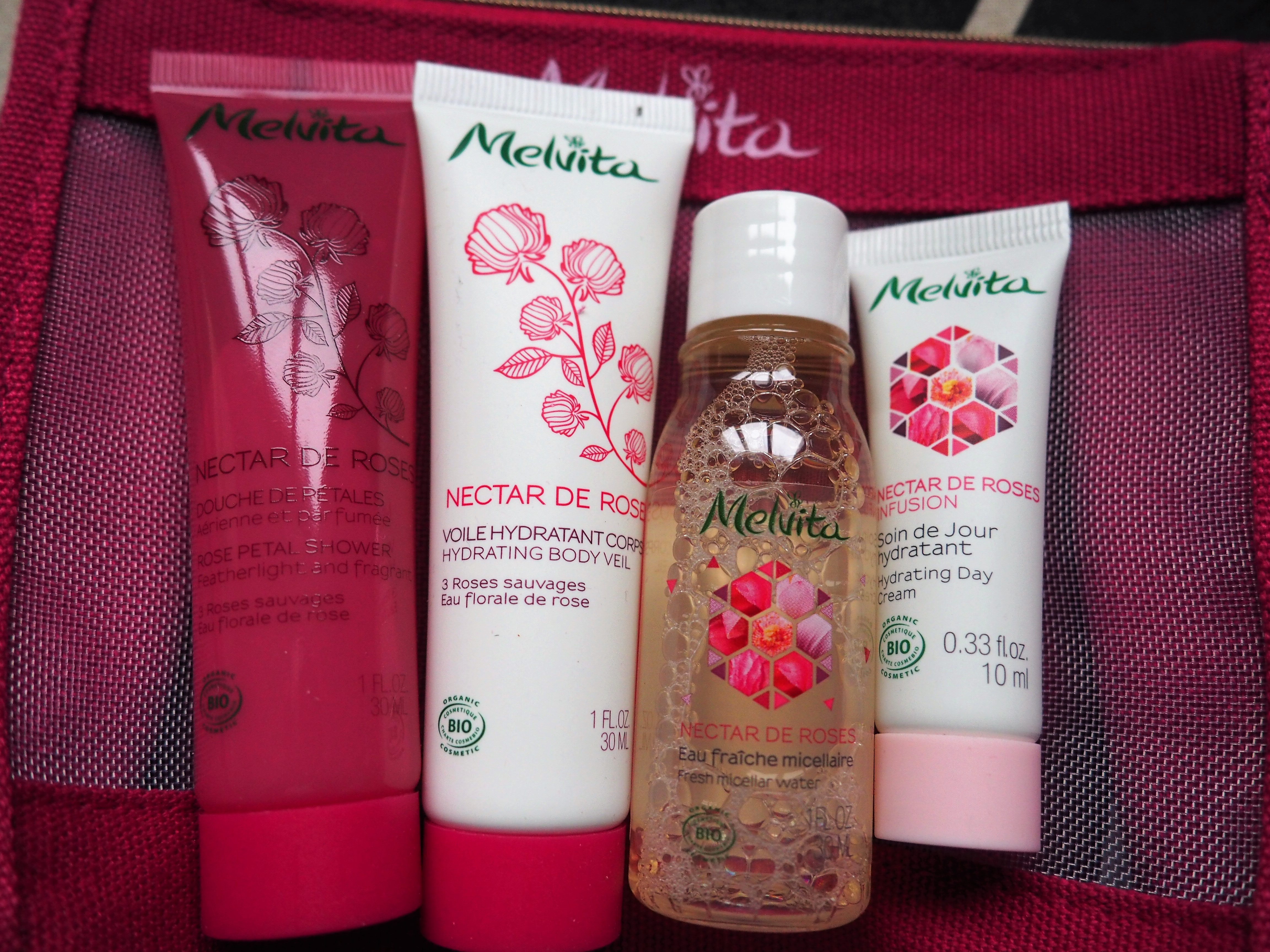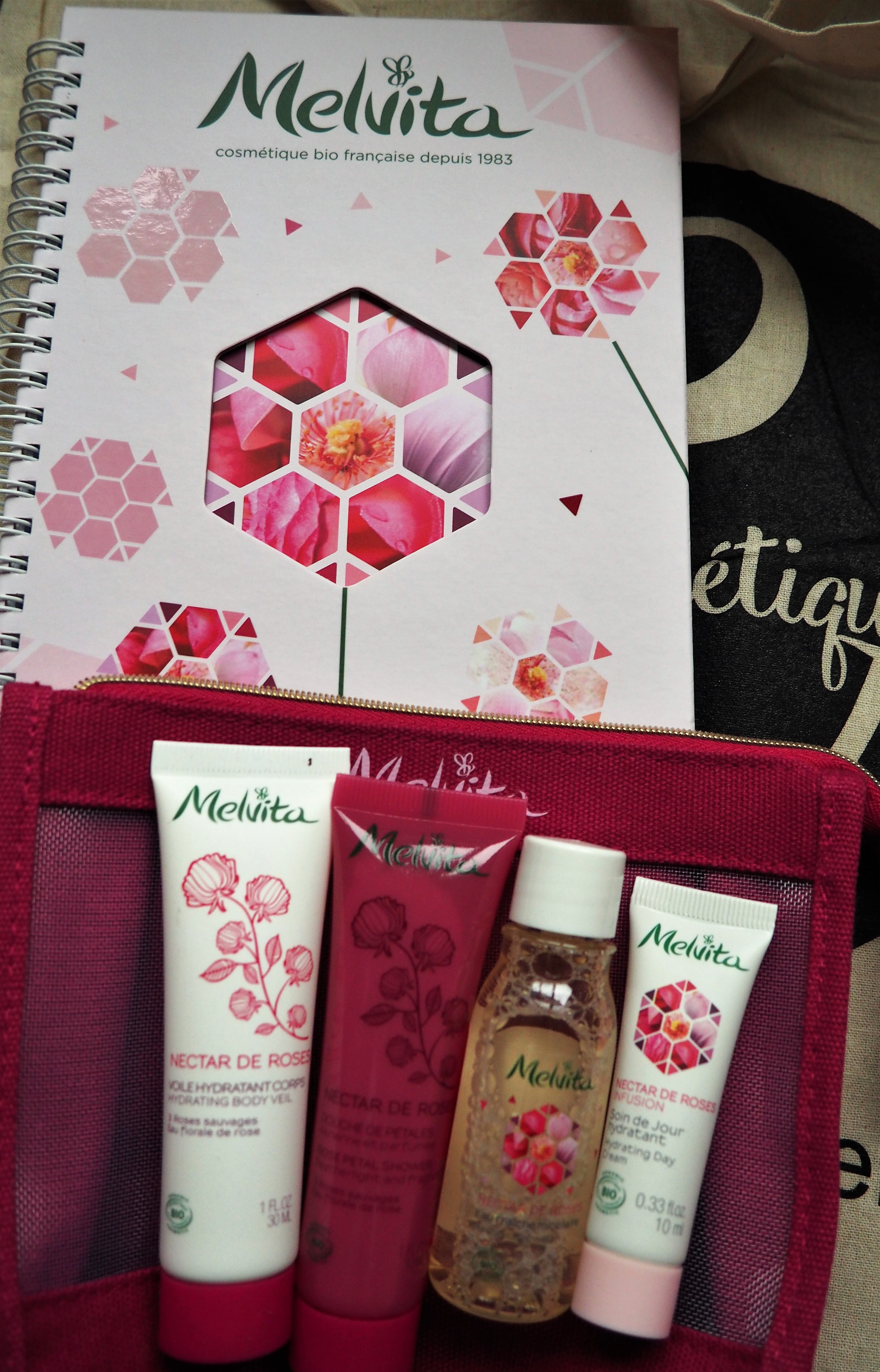 Une trousse de 4 mini-produits Nectar de Rose de Melvita ainsi qu’un cahier à spirales.