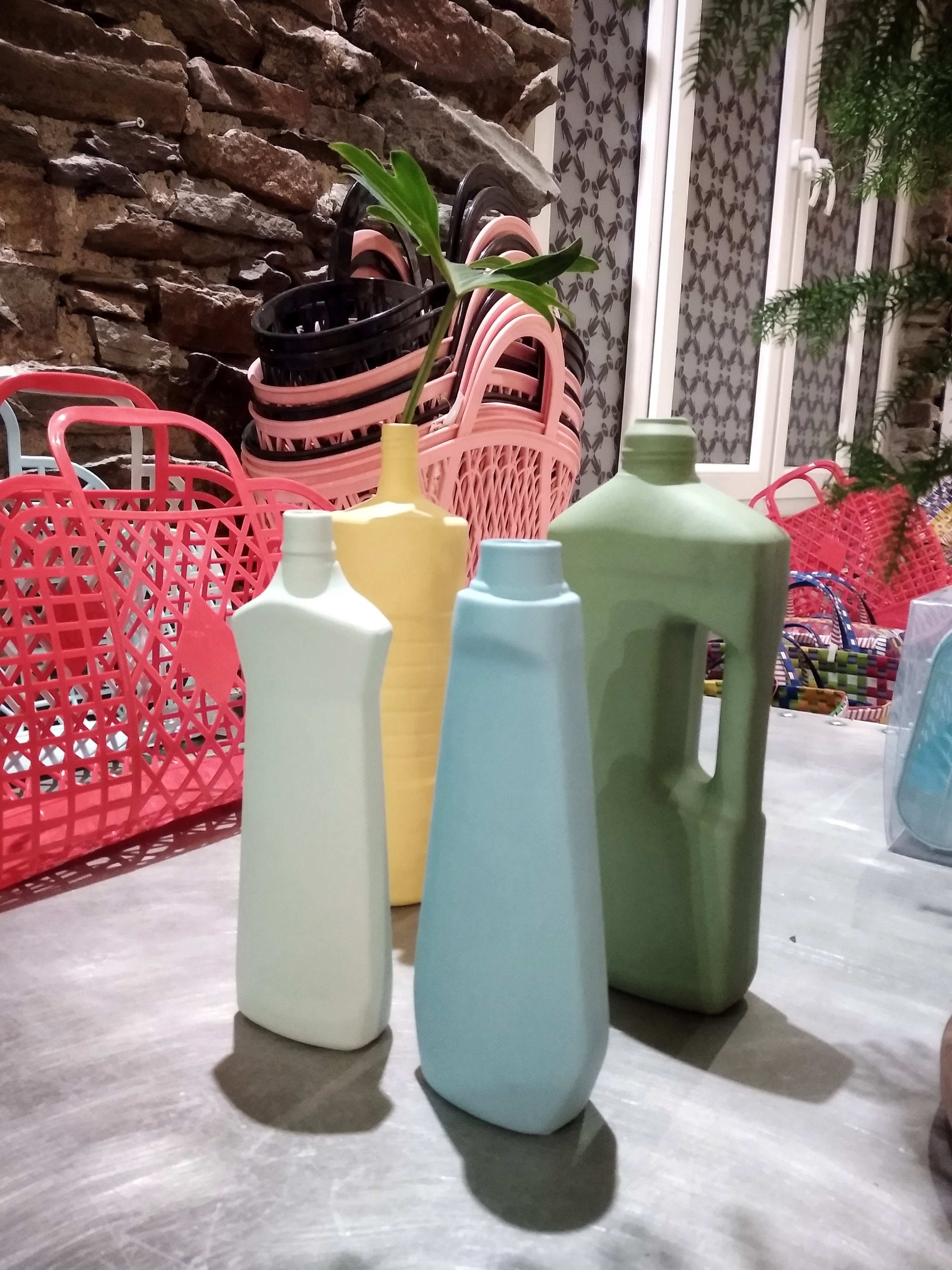 accessoires, un peu de vide dressing, de la décoration et des plantes vertes (de chez Coquelicot, rue paré), avec les vases Foekje fleur (très original, en porcelaine, en forme de bouteilles de produits d’entretien), les lacets Sliwils (très beaux, faits avec du ruban), et les paniers Sunjellies et Mowgs (déjà présents aux dernières ventes, en plastique et rétro).
